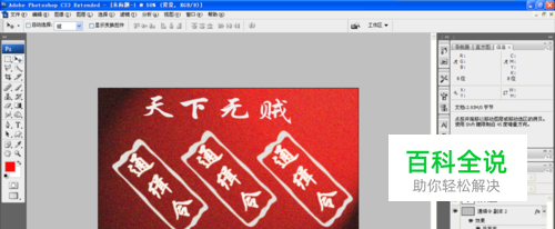 设置前景色为红色,按alt+delete键填充红色,选择直排文字工具,输入文字,设置字体颜色为白色,选择自定义形状工具,绘制工具,选择滤镜,杂色,添加杂色,点击确定。