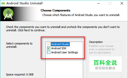选中你要卸载的选项,点击“Next”。如果你想卸载所有的内容,可以同时选中这三项;如果你想保留Android相关的环境变量配置信息,那就不要选择第三项。