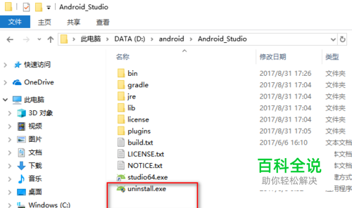 打开Android studio安装路径,双击“uninstall.exe”程序。(当然,也可以在控制面板中卸载。)