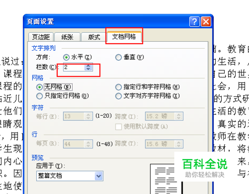 在“页面设置”对话框里,选择“文档网格”选项卡,把“栏数”改为2,文字就分成两栏显示了。