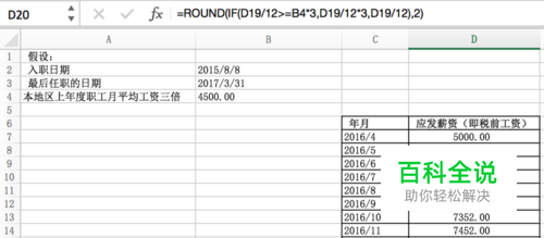 然后,确定月工资标准。 如下图,round函数语法为round(number,digits),digits为2即保留两位有效数字 另外,用if函数IF(logical_test,value_if_true,value_if_false)来判断比较该员工的月工资是否高于当地职工上年度的3倍平均工资。即,若D19/12>=B4*3为真,则月工资为D19/12*3,否则月工资为D19/12