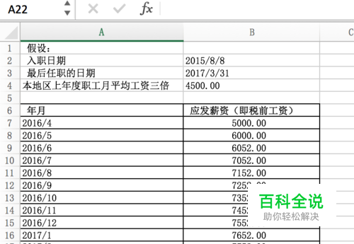 首先,进行假设。假设该员工2015/8/8入职,任职到2017/3/31,当地2016年职工月平均工资为4500,并且假设他离职前12个月的工资如下图。 我们需要计算的就是这个人2017/3/31前十二个月(也就是2016/4-2017/3)的平均工资,且要考虑劳动法47条的规定“若月工资高于用人单位所在地上年度职工月平均工资三倍的,支付标准为三个月月工资”。