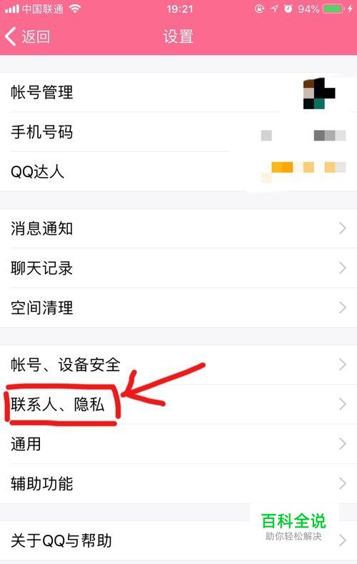 点击“设置”进入页面后,找到“联系人、隐私”这条栏目,然后点击进入“联系人、隐私”