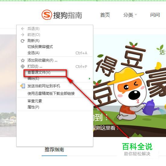 如图,打开浏览器之后,在网页单击鼠标右键,选择“查看源文件”。
