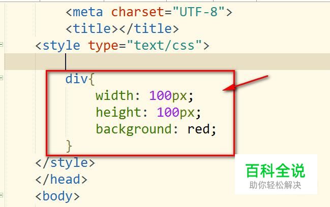 接着我们设置CSS样式,如图,我设置div宽度和高度都是100像素,背景色为红色。