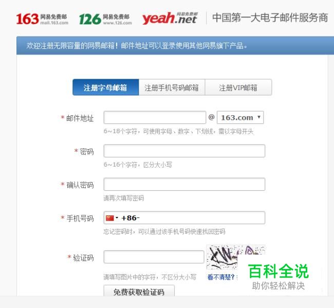 然后进入注册邮箱页面,走进注册流程,在注册页面我们可以看到有三种邮箱供我们选择注册,分别是字母邮箱注册、手机号码邮箱注册以及VIP邮箱注册,三个邮箱最大的区别是前两个是免费邮箱,后面VIP邮箱是使用收费的。我们根据具体自己的需求选择相应的邮箱。