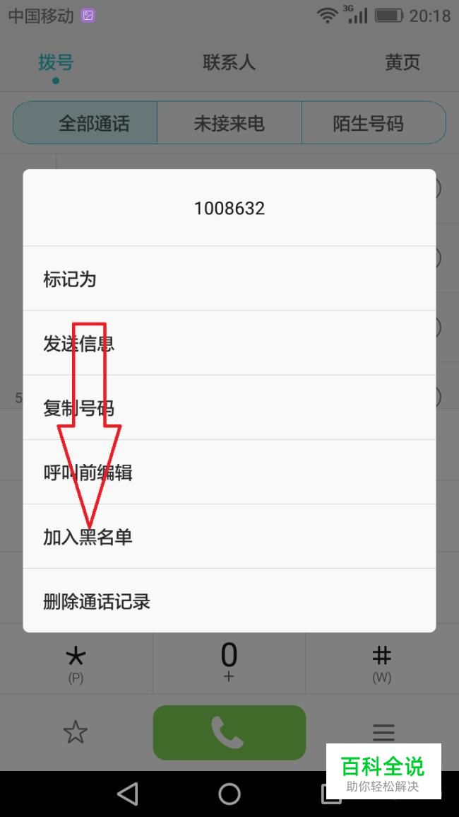 在手机通话记录界面,长按骚扰电话直到出现弹窗,直接点击加入黑名单。