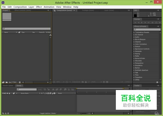 打开aftereffect这款软件,进入aftereffect的操作界面,如图所示: