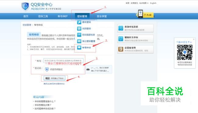 首先,打开QQ安全中心(https://aq.qq.com) 然后,鼠标移动到【密码管理】选择【账号申诉】点击进入 按照图所示1.2.3.4.步骤依次填写完整点击【确定】