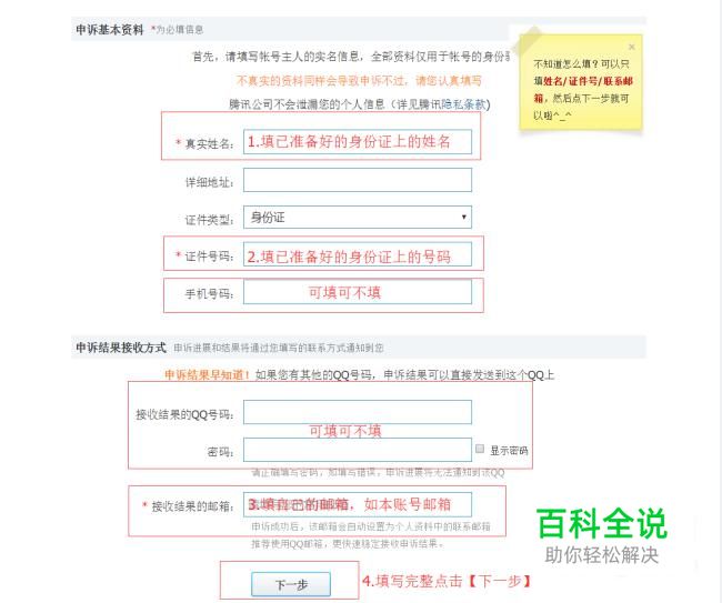 进入<账号申诉>页面 按照图所示1.2.3.4.步骤依次填写完整点击【下一步】