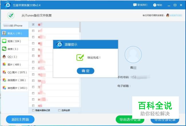 勾选要恢复的联系人,点击“导出选中记录”即可恢复丢失的苹果手机联系人;勾选“选择全部”, 然后点击“导出全部记录”可恢复全部联系人。