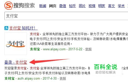 搜狗浏览器里输入“支付宝”,搜索,进入支付宝主页