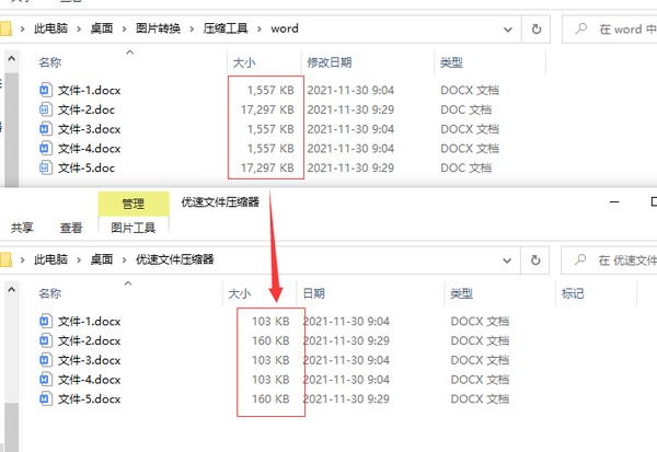 步骤4,通过对比可以看到,压缩后的word文档体积比压缩前小很多,压缩成功。