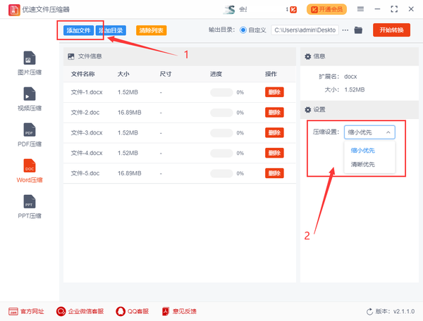 步骤2,点击软件左上角的【添加文件】蓝色按键,将需要压缩变小的word文件导入到软件中,支持批量导入和批量压缩,提高效率。然后进行压缩设置,选择一种压缩方式(目前支持两种压缩方式)。