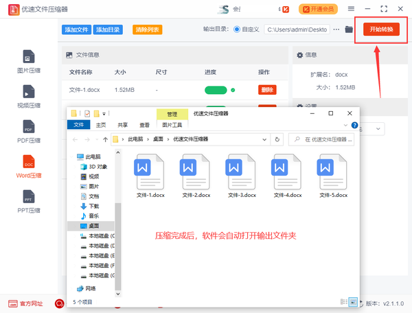 步骤3,设置完成后点击右上角【开始转换】红色按钮,启动文件压缩程序,完成压缩后软件会自动打开输出文件夹,压缩后的word文档会保存在这里面。