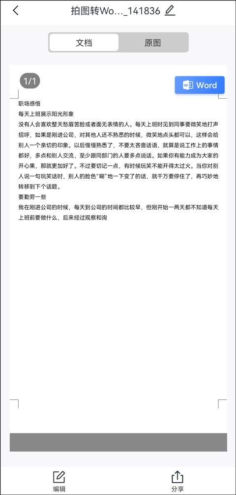 第五步:支持在线查看该word文档,原照片上的文字以电子文档的形式保存,页面下方则是可以点击“编辑”,对word文档进行更改。