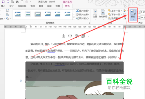 然后就能随意把图片移动到想要遮挡的文字上面。如果图片大小不适当的话,切换到图片工具“格式”选项卡,点击“裁剪”,把图片裁剪到合适大小即可。