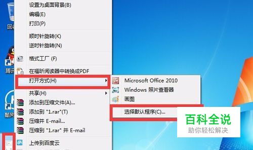 先右击所要打开图片,将鼠标放到“打开方式”,然后在子菜单点击“选择默认程序”。