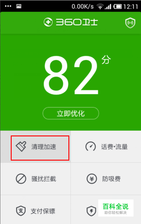 下载并安装360手机卫士,打开360手机卫士,选择“清理加速”如图: