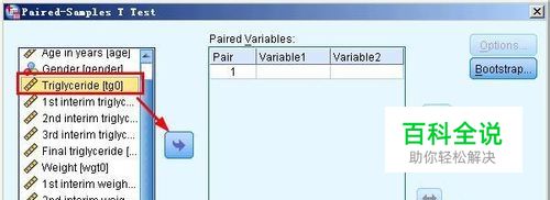 你会看到如下所示的对话框,这里我们要看好了怎么对变量进行配对,先从左侧的列表里选择一个变量,比如选择triglyceride这个变量,点击如图所示的箭头,添加到右侧的列表