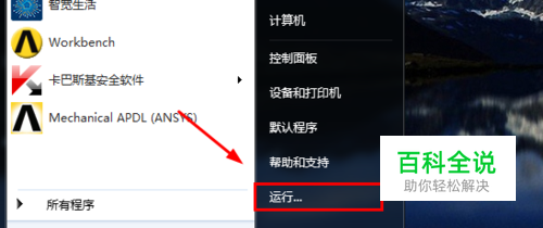 首先,打开开始菜单,选择运行,如图所示