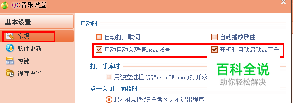 怎么取消qq音乐自动登陆 2025-05-31 23:49:44 第一步、登陆qq音乐,然后点击面板上面的主菜单-设置。如下图: 第二步、然后选择常规,在“启动自动关联登录QQ帐号”和“开机是自动登陆”前面的勾去掉。如下图: 赞 (0) 相关推荐 windows10系统下如何取消QQ宠物自动登陆 windows10系统下如何取消QQ宠物自动登陆 具体如下: 1.登录QQ之后,点击QQ左下角的"设置"; 2.在"设置"的窗口中,找到"登录后自动运 ... iphone中如何关闭QQ音乐自动下载 关闭iphone中QQ音乐自动下载问题 操作方法 01 打开QQ音乐,在"我的音乐"里面,点击全部歌单,进入自己创建的歌单列表. 02 进入歌单之后依次点击每个你想要关闭自动下载的 ... QQ音乐2014登陆失败以及没有声音怎么办 QQ音乐2014登陆失败怎么办? 造成QQ音乐214登录不上现象的原因有如下三种可能: 一、木马病毒对qq音乐2014的必要组件或文件进行破坏,导致QQ音乐登录失败,登陆不上的情况发生。 二、Wind ... qq音乐登陆不上怎么办?qq音乐无法登陆问题的解决办法介绍 qq音乐登陆不上,qq音乐无法登陆,大部分的QQ音乐用户都曾经遇到过这个问题,不知道大家是如何解决的。小编这里为大家整理搜集了最全的qq音乐无法登陆解决办法 1、首先检查是否网络问题,请随便打开一个网 ... 不让qq宠物登录的方法 如何取消QQ宠物自动登录? 昨天QQ官方出了一个新版本QQ,QQ2011Beta3安全防护版,丫丫安装了新版本,然后每次开QQ,QQ宠物自动登录了 总是要我退出,很烦人的,虽然不喜欢,但我也不希望这么可爱的QQ宠物死掉,所以我想 ... QQ音乐怎么登陆QQ号 现在很多人在使用QQ音乐听歌的时候会想要登录自己的QQ号,从而在别的电脑上登录QQ音乐的时候也能看到关联的歌单,不会使喜欢的歌曲丢失,那么具体应该怎么操作呢?下面小编就来教教大家QQ音乐怎么登陆QQ号 ... 如何取消QQ音乐的接收桌面消息通知 今天给大家介绍一下如何取消QQ音乐的接收桌面消息通知的具体操作步骤.1. 首先打开电脑,找到桌面上的QQ音乐图标,双击打开.2. 进入主页面后,点击页面右上角的三横图标.3. 在打开的菜单中,选择设置 ... 如何关闭QQ音乐自动进入驾驶模式功能 现在很多人喜欢用QQ音乐连接车载蓝牙,默认情况下软件启用了自动进入驾驶模式功能,有些用户想知道如何关闭该功能,接下来小编就给大家介绍一下具体的操作步骤.具体如下:1. 首先第一步打开手机中的[QQ音乐 ... 如何设置手机QQ音乐自动进入播放页 现在很多人喜欢在手机上用QQ音乐听歌,有些用户想知道如何设置手机QQ音乐自动进入播放页,接下来小编就给大家介绍一下具体的操作步骤.具体如下:1. 首先第一步打开手机中的[QQ音乐]App.2. 第二步 ...