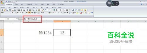 提取文本串中的字符,我们首先想到的是mid函数,如图,字符串MM1234在C2单元格中,要提取其中的12,可用公式=mid(C2,3,2)。