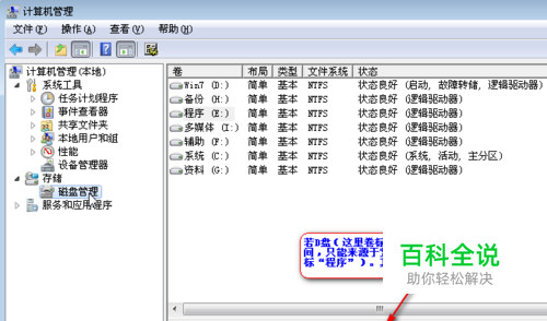 在随即弹出的“计算机管理”界面中,单击“存储”下的“磁盘管理”,将显示磁盘管理界面。