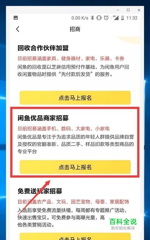 进入咸鱼招商后我们可以在目录中找到咸鱼优品商家招募,点击下面的的马上报名按钮