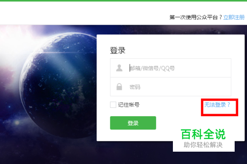 首先我们先打开微信公众账号的首页,打开之后会出现如图所示,此时我们单击“无法登录?“按钮。