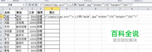 点击档案表格中E2单元格,输入公式 ="<table><img src=""c:\人物\"&A2&".jpg""width=""176""height=""220"">" ,其中src后面的内容为照片存放的目录路径,width是宽度,height是高度,A2是照片的名称,大家可以自行修改为照片文件名。
