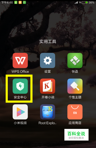 在小米手机界面中找到“安全中心”应用图标,点击进入。如图所示: