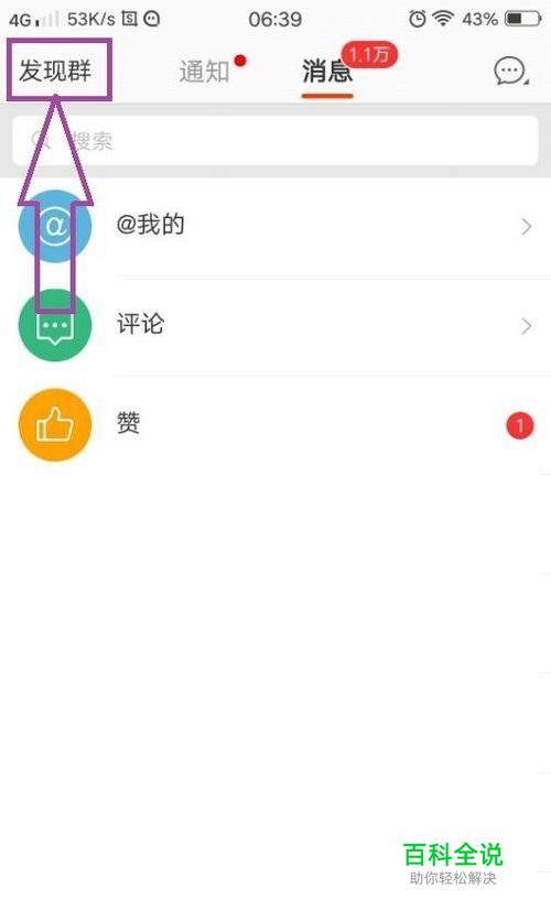 打开自己的微博,进入到消息页面,在页面的左上角我们可以看到“发现群”,