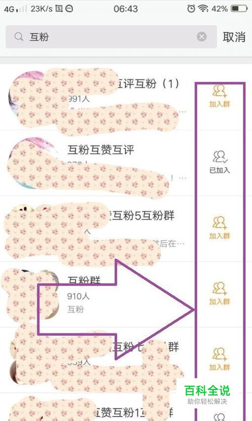 我们可以在搜索栏中键入“互粉”,然后进行搜索,就可以在搜索结果中找到很多互粉的群,在页面上我们可以看到“加入群”。