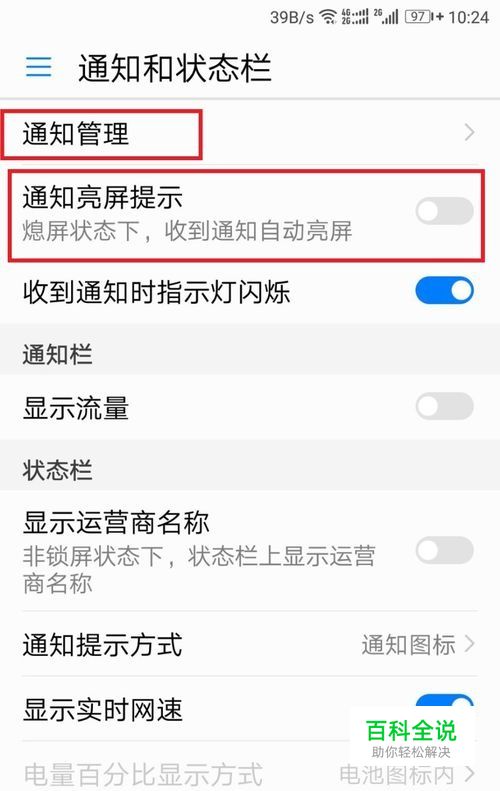 打开华为手机的“设置——通知和状态栏——通知亮屏提示(如想启用手机收到信息自动亮屏,这个需要开启,会增加耗电)——通知管理。