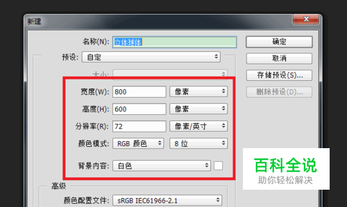 按Ctrl+N键,新建立一个文件,大小:800 x 600像素、72分辨率、RGB模式。如图所示:
