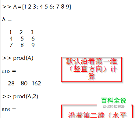 如果A是一个矩阵,使用prod(A)默认将沿着第一维计算连乘(把每一列视作列向量计算连乘) prod(A,2)可以带有第二个参数维度。如图,将沿着第二维计算连乘。