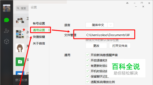 首先,我们看电脑上是否保存了收到的微信语音消息文件,点击电脑版微信下方的三横小图标,再点击“设置”,进入“通用设置”,可以看到微信文件的保存位置,默认为:C:\Users\计算机名称\Documents\WeChat Files\,其中Users文件夹即为“用户”文件夹,Documents文件夹为“文档”文件夹。