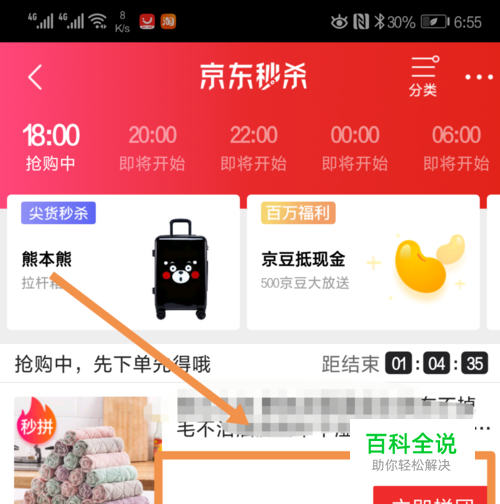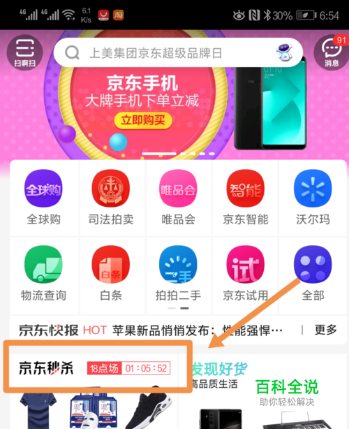 我们打开手机上的“京东”APP,登录自己的账号后,点击首页。选择页面中的“京东秒杀”进入秒杀界面。