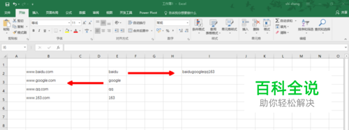 同时,如果我们想将单元格中的字符和其他文本结合起来,也可以使用CONCATENATE函数。如图所示,想将右侧的文字变成左侧的网址形式,按下面步骤使用此函数。