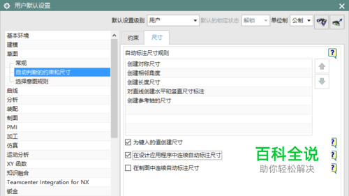 在用户默认设置里面找到“ 草图”选项并选择,然后会弹出三个备选选项,选择第二个选项“ 自动判断的约束和尺寸”,在右边弹出的菜单里选择“ 尺寸”选项,在“ 尺寸”选项里面取消“ 在设计应用程序中连续自动标注尺寸”的勾选。