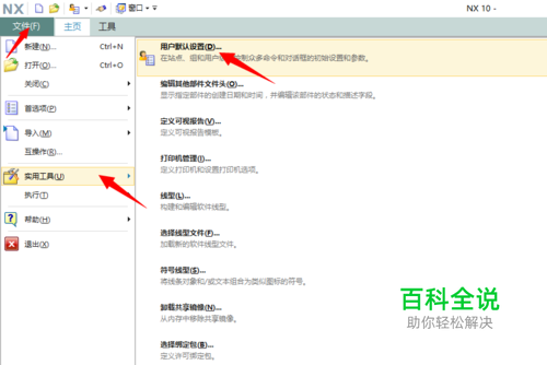 启动UG后,单击右上角“ 文件”图标,弹出下拉菜单栏选择“ 实用工具”里的“ 用户默认设置”。