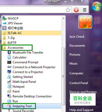 点击“ 开始”->“附件”->"snipping tool"打开截图工具。 操作如图: