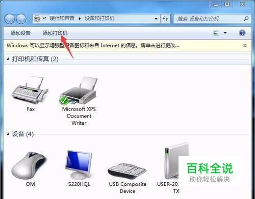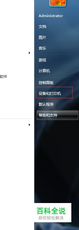 点击屏幕左下角的电脑开始键,选择这里面的设备和打印机