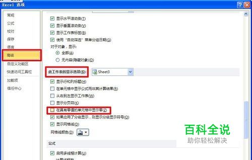 在弹出的“Excel选项”对话框中,左边点击“高级”,右边找到“此工作表的显示选项”,将“在具有零值的单元格中显示零”前的勾去掉。 看下图