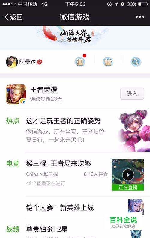 点击比赛界面: 微信的游戏中心里,找到王者荣耀的相关界面,这里会有标识,比如最近的比赛,铠的个人赛,继续点击进去。