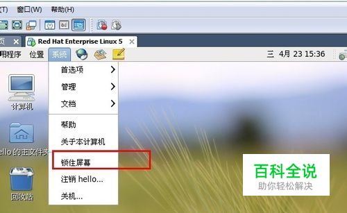你过你登陆Linux 系统.不是用root账号登陆的.而是普通用户. 首先找到"系统"这个菜单,点击下面的"锁住屏幕". 如果你是root账号登陆的.就点击"系统/注销root"