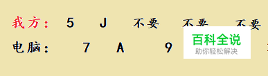 该残局分成3轮来解释出牌过程。 第一轮:我方先出牌。 我方出【5】,电脑出【7】, 我方出【J】,电脑出【A】, 我方 要不起,电脑出【9】 , 我方 不要 ,电脑出【10】, 我方 不要 ,电脑获得“出牌机会”。 该轮完整对局过程如下图(第二张图是本轮对局后的牌局):