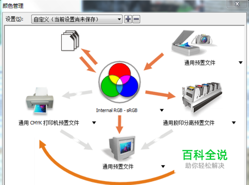 菜单栏点击【工具】下拉列表【颜色管理】,扫描仪或打印机的就设置好配套的预置文件,选择相符型号。如果没装就按图设置,箭头按图点亮变红色