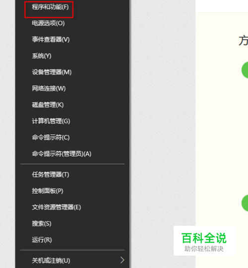我们在桌面左下角的任务栏,右击开始菜单,弹出选择“程序和功能”。也可以在cortana搜索框中输入“程序和功能”打开。